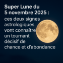 Le mois de novembre 2025 débute sous le signe d’un événement céleste exceptionnel : une Super Lune en Taureau, prévue pour le 5 novembre. Cet alignement rare promet de faire vibrer le ciel nocturne… et le cœur de deux signes du zodiaque en particulier, qui verront leur chance financière et matérielle s’amplifier. Découvrons ensemble ce que cette Pleine Lune a à nous offrir.